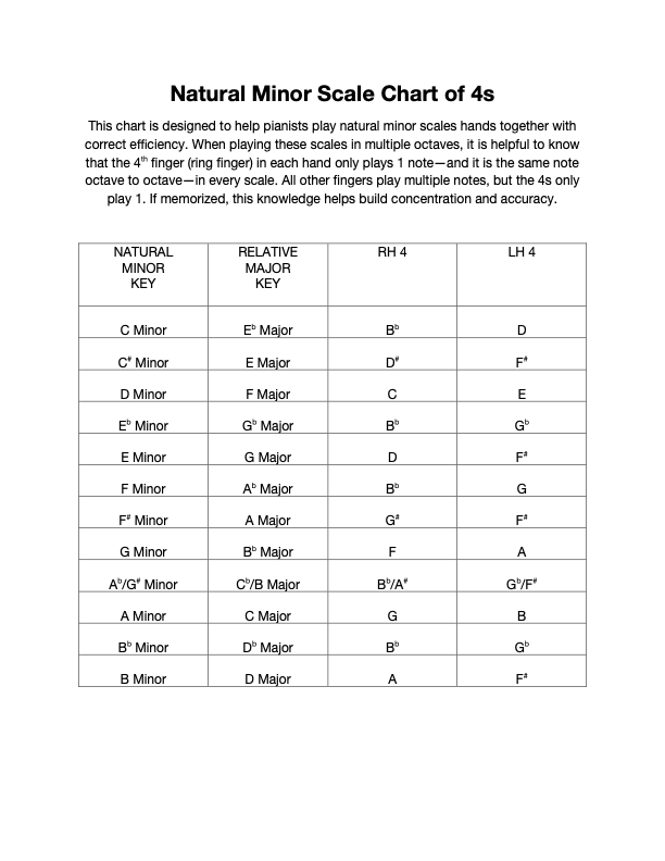 This chart is designed to help pianists play major scales hands together with correct efficiency.